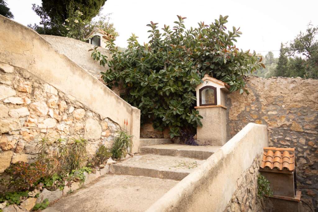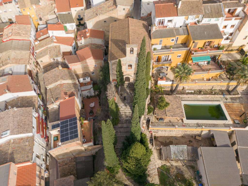 La antigua iglesia parroquial de Santa María –también conocida como Ermita de la Virgen de arriba o de la Natividad de la Virgen– está ubicada en lo alto de la población, en el extremo meridional de la peña que separa el núcleo primitivo y junto al antiguo cementerio, actualmente reconvertido en tierras de cultivo. El acceso principal se realiza a través de un Via Crucis que se inicia en la calle Escaleta y sube zigzagueando hasta la cima del risco. Hay otra entrada, desde la parte trasera del edificio, que comunica con la calle Ermita. Cuando accedamos por la calle Escaleta podremos disfrutar de las representaciones de la vida de Jesucristo a lo largo de las escaleras del Calvario. A lo largo de las escaleras del Calvario encontramos unas capillas de base rectangular de una altura máxima de unos 105 cm donde encontramos representados los pasos del Via Crucis (primera caída de Cirst bajo el peso de la cruz). Las escenas en alto relieve, que parecen hechas con yeso, están protegidas por un cristal (excepto en la capilla VII, que está roto, y en las VI, IX y XIV, que han desaparecido). También están deterioradas todas las partes de madera de estas ventanas y las partes de metal (lieba y bisagras). Fueron reconstruidas en 1960, aunque todo el elemento urbano es muy anterior.